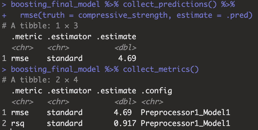 finalize_workflow 함수를 통해서 우리가 Iterative Search를 통해 찾은 값을 전달할 수 있으며 하이퍼파라미터 값이 전달된 모델을 통해서 Train data(Train + Validation, 최종모델이므로 가능한 모든 데이터 사용) 데이터를 적합하고 Test data로 모델의 성능을 평가해야 합니다. last_fit 함수를 통해 간단하게 구현할 수 있으며 최종 성능지표는 rmse 기준 4.69 정도 나오는 것을 확인할 수 있습니다.