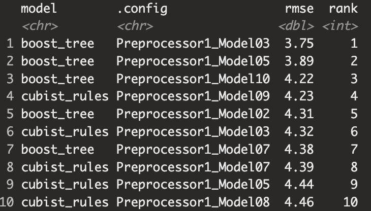 tune_grid를 개별 워크플로에 적합하면 나면 하이퍼파라미터 값에 따라 Training data를 학습하고 Validation data를 통해 성능지표를 도출합니다. 여기서는 RMSE를 기준으로 모델을 선택하며 rank_results 함수와 autoplot 함수를 통해서 모델들의 성능을 확인해 봅시다.