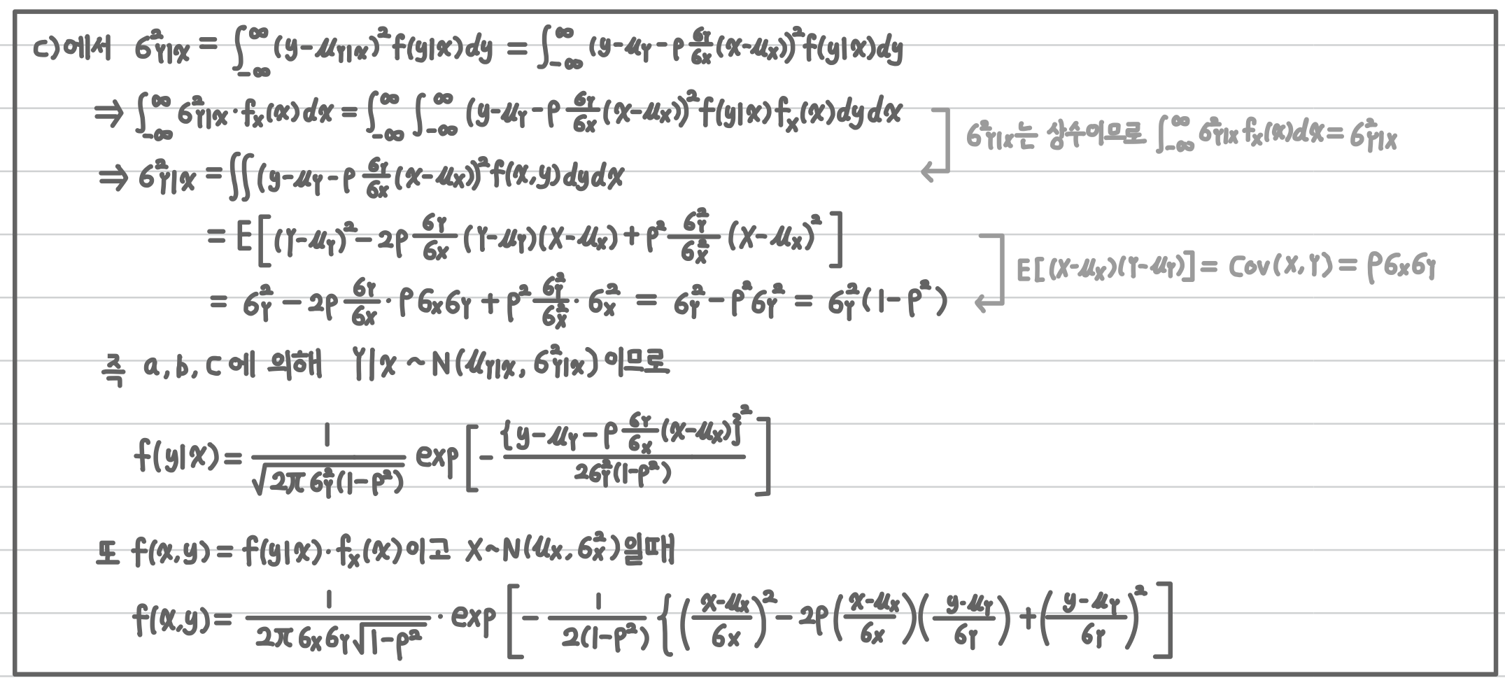 - 두번째 줄은 첫번째 줄 양변에 $f_X(x)$를 곱해주고 적분해준것입니다. ($\sigma_{Y|X}^2$는 상수이므로 적분해도 그대로 나옴)