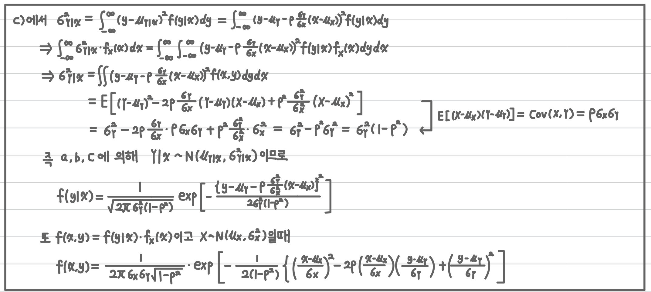 또한, 조건부 분산이 상수로 일정하다는 것은 $x$값에 따라 상관없이 $Y|x$의 분산의 값이 일정하다고 볼 수 있으므로 아래와 같이 이변량 정규분포의 확률분포를 유도 가능합니다.