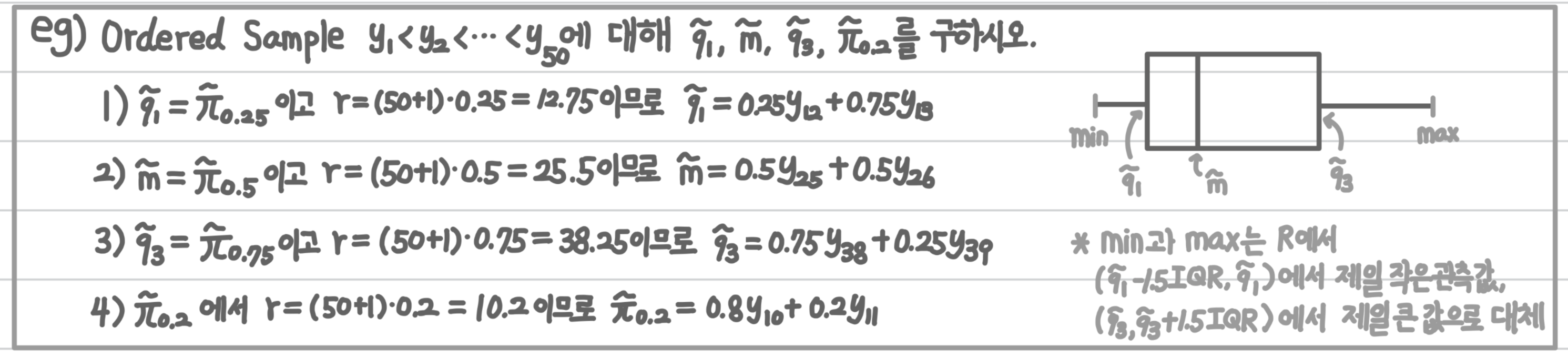 좀 더 정확하게 표본 백분위 수를 구하는 방법은 $r=(n+1)p$를 구하고 $r$이 정수라면 $y_r$을, $r$이 정수가 아니라면 $y_r$과 $y_{r+1}$의 가중평균을 구해서 얻을 수 있습니다.