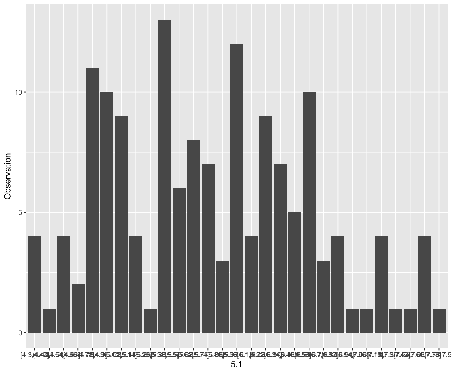 draw_histogram_ggplot2(data=iris$Sepal.Length, bins=10)