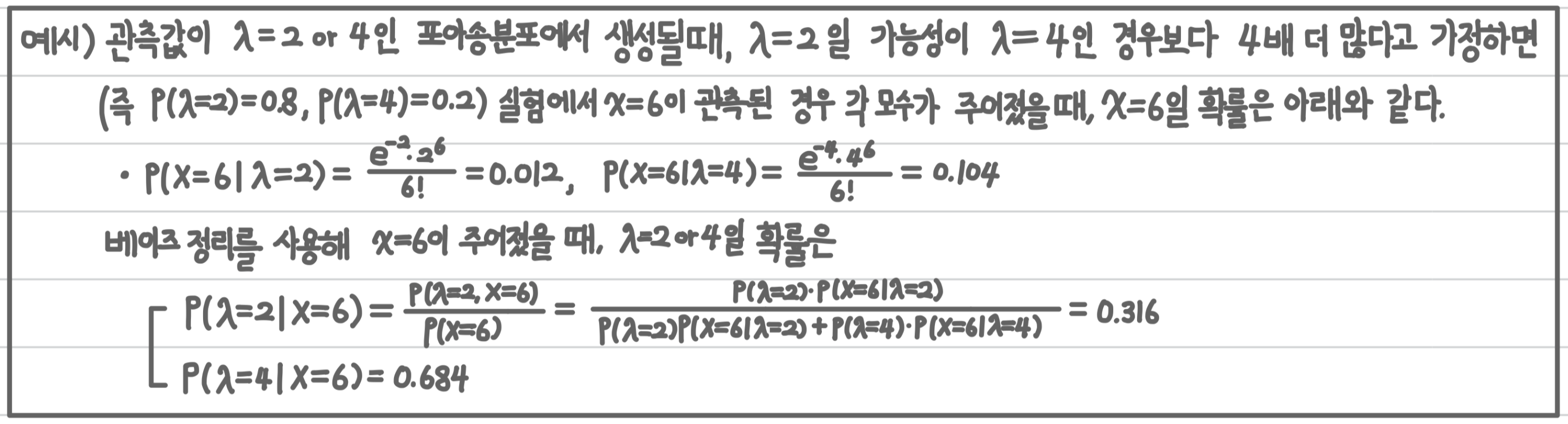 기존에 $P[\lambda =2] = 0.8$, $P[\lambda = 4] = 0.2$인 모수의 확률이 데이터가 주어지고 나서 $P[\lambda = 2 | X = 6] =0.316$, $P[\lambda = 4 | X=6] = 0.684$로 바뀐 것을 확인할 수 있습니다.