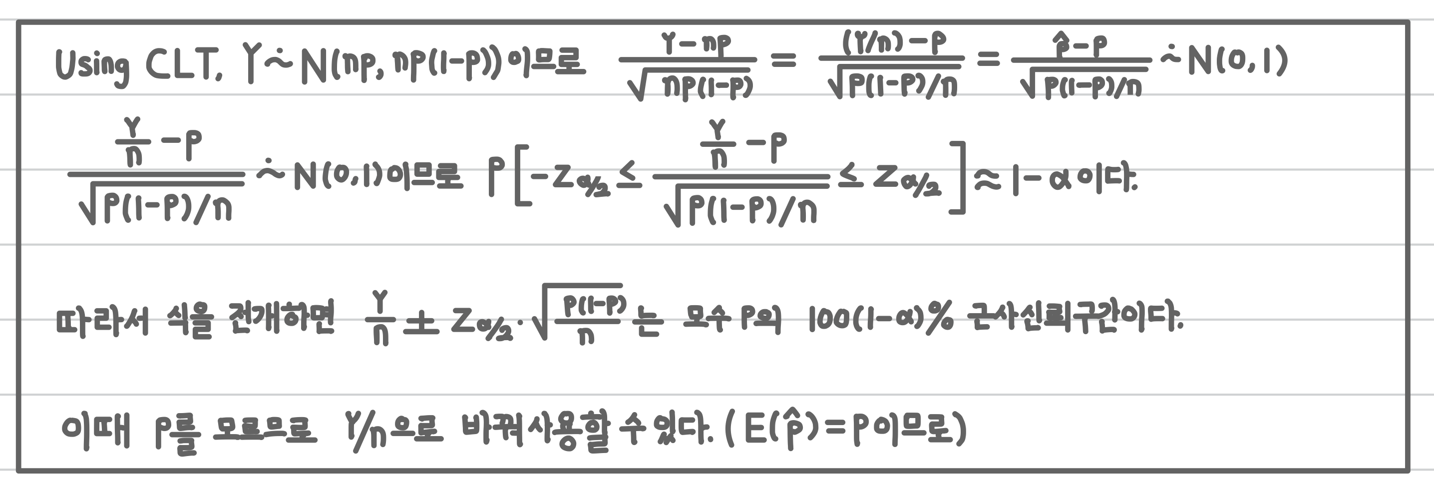 - $p$의 $100(1-\alpha)$% 근사 신뢰구간 : $[\frac{Y}{n} \pm z_{\alpha/2}\sqrt{\frac{y/n(1-y/n)}{n}}]$