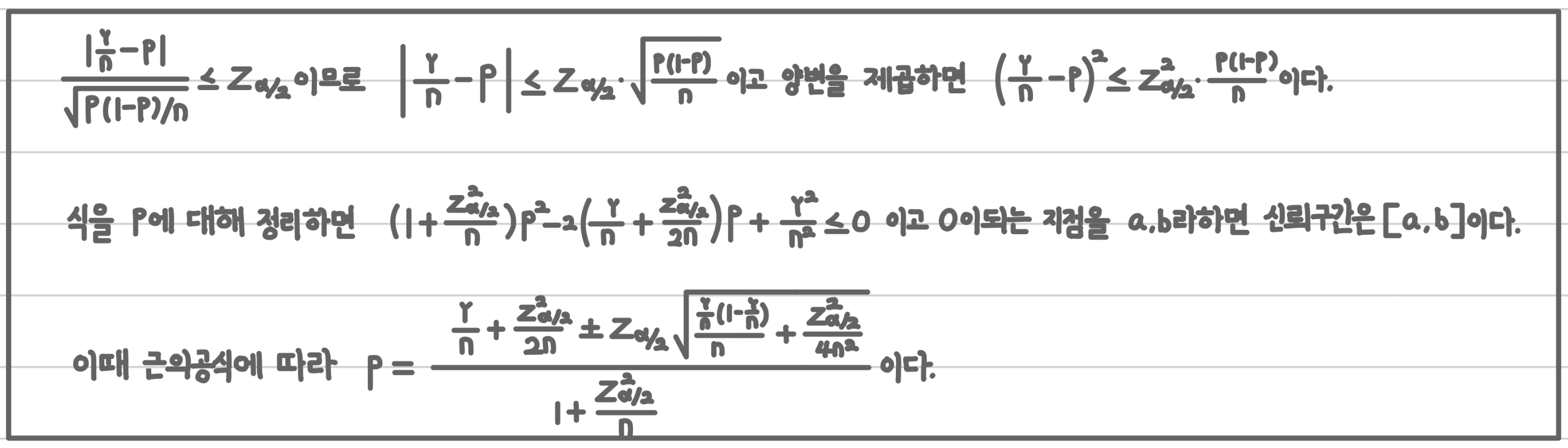 - $p$의 $100(1-\alpha)$% 근사 신뢰구간 : $[\frac{\frac{Y}{n} + \frac{z_{\alpha/2}^2}{2n} \pm z_{\alpha/2}\sqrt{\frac{\frac{y}{n}(1-\frac{y}{n})}{n} + \frac{z_{\alpha/2}^2}{4n^2}}}{1+\frac{z_{\alpha/2}^2}{n}}]$