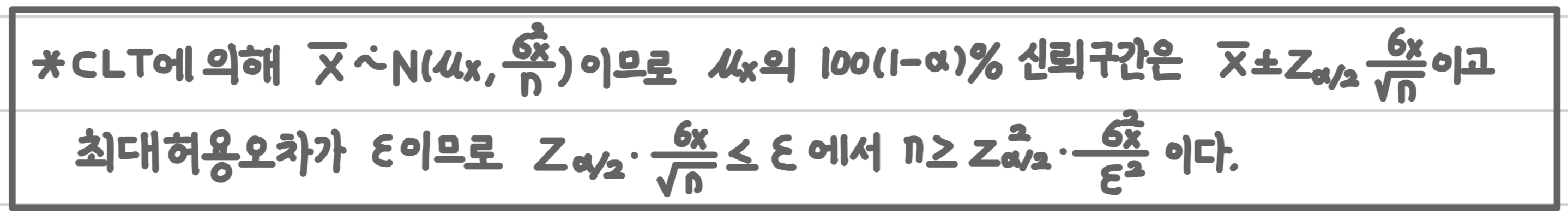 - 천장함수(Ceiling function)을 이용해 ⌈$\frac{z_{\alpha/2}^2\sigma^2}{\varepsilon^2}$⌉와 같이 표시할 수 있습니다.