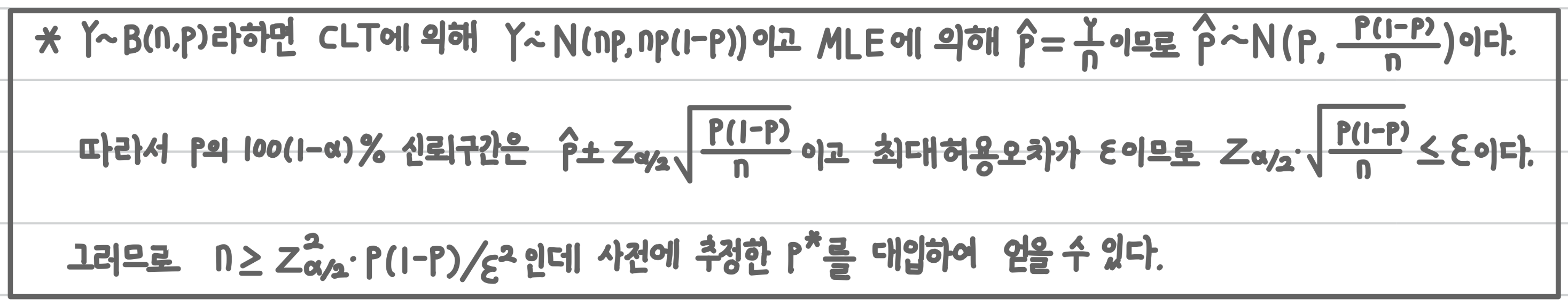 2. (Binomial) 모비율 $p$가 [$\hat{p} \pm \varepsilon$]에 포함되기 위한 표본 수 $n \geq \frac{z_{\alpha/2}^2p^*(1-p^*)}{\varepsilon^2} \geq \frac{z_{\alpha/2}^2}{4\varepsilon^2}$
