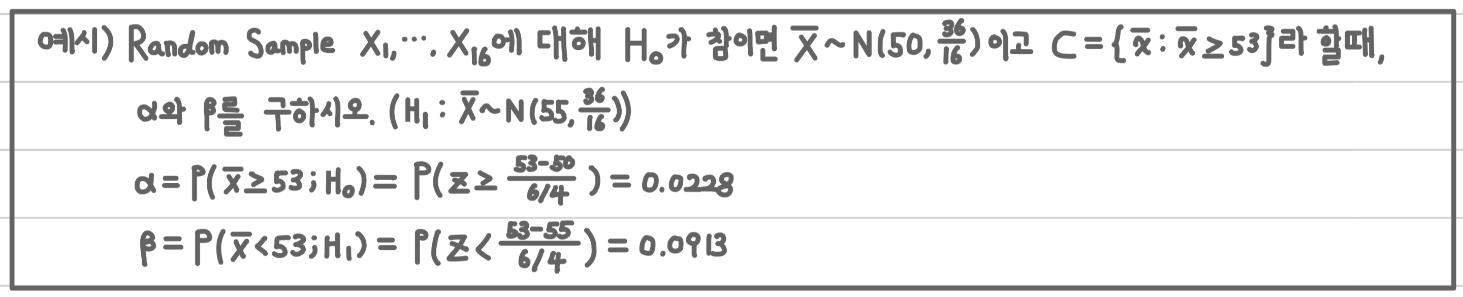 - 제 2종 오류(Type II Error)의 확률은 $\beta$로 표시하며 $\beta = Pr[(X_1, X_2, \cdots, X_n) \notin C | H_1]$
