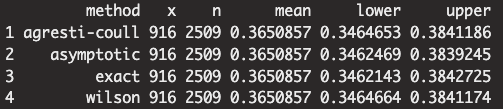 filter(method %in% c("agresti-coull", "asymptotic", "exact", "wilson"))