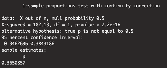 또한 귀무가설 $H_0 : p = 0.5$, 대립가설 $H_1 : p \neq 0.5$ 검정을 아래와 같이 prop.test를 통해 진행했습니다.