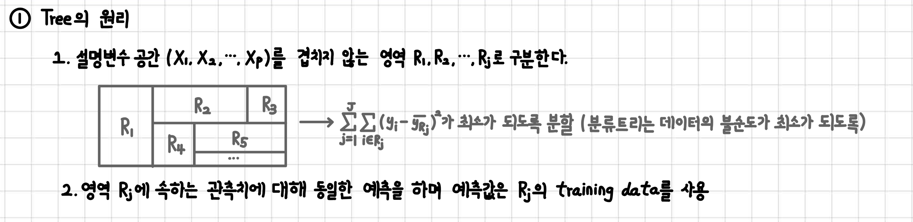 좀 더 구체적으로 말하면 분기마다 모델에 사용하는 설명변수($X_1, X_2, \cdots, X_p$)가 구성하는 Sample Space를 더 작은 영역인 Sub-Space들로 나누는데요. 이때, 하나의 분기에서 여러개의 Sub-Space로 나눠질 수 있으나 겹치지 않는다는 특징이 있습니다. 트리를 나눌때 Sub-Space의 분산이나 불순도가 최소가 되도록하며, 특정 조건을 만족할때까지 트리를 잘게 쪼개나갑니다. 이렇게 트리모델이 구축되면 Sub-Space의 관측치를 이용해서 예측하게 됩니다.