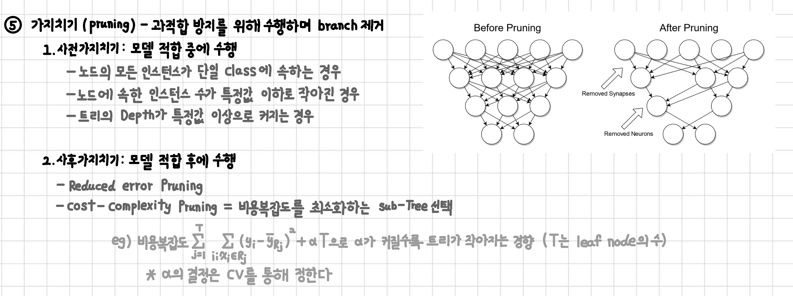 가지치기는 과적합 방지를 위해서 사용되며 사전가치지기와 사후가지치기로 구분됩니다.