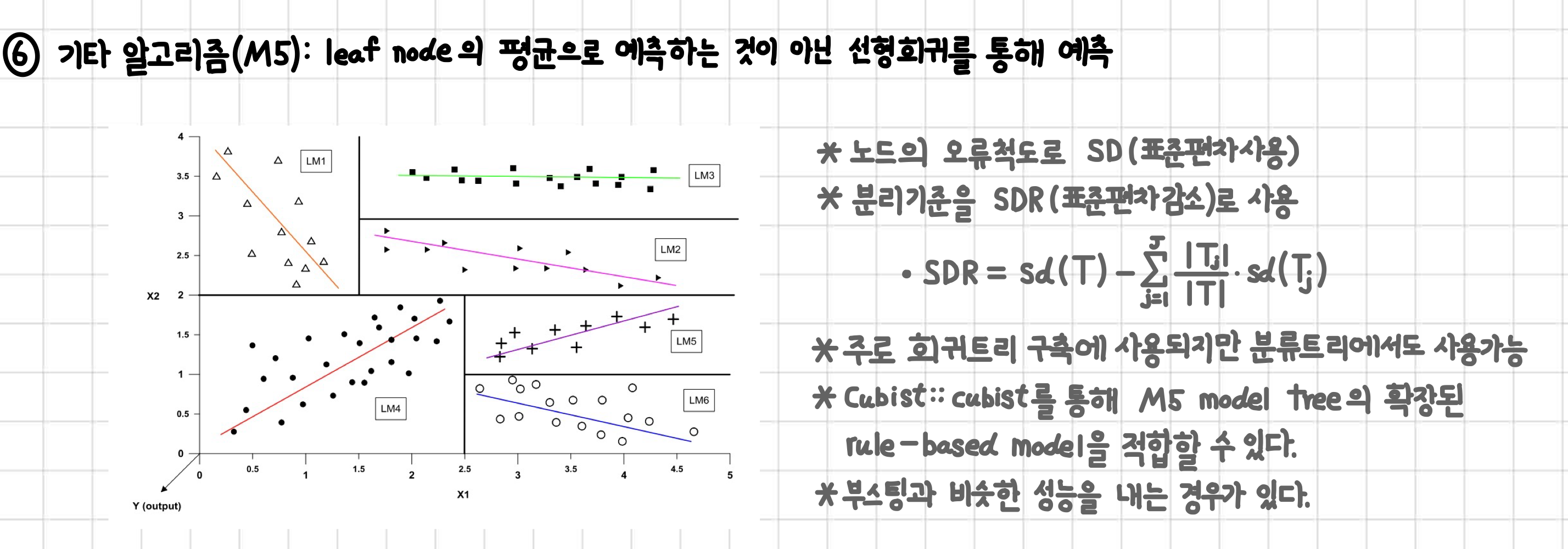 - M5 : 주로 회귀트리에 사용되며 각 영역의 관측치로 적합한 선형회귀를 사용해 예측하는 알고리즘