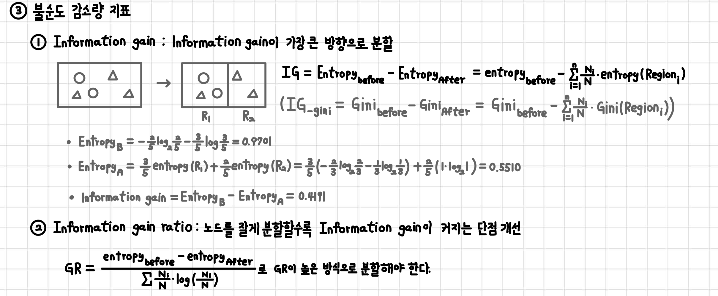 - 정보이득(Information Gain) : 분기 전 노드의 엔트로피와 분기 후 자식 노드들의 엔트로피 가중 평균의 차이