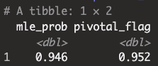 모수의 참값이 MLE 기반의 CI, Pivotal 기반의 CI에 포함되는 비율을 구하면 다음과 같이 94.6%, 95.2%가 나오네요.