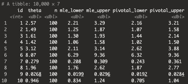 pivotal = map2(theta, n, ~theta_CI(.x, .y, alpha=0.05, method="pivotal"))) |>