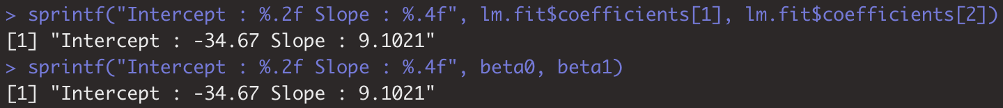 sprintf("Intercept : %.2f Slope : %.4f", beta0, beta1)