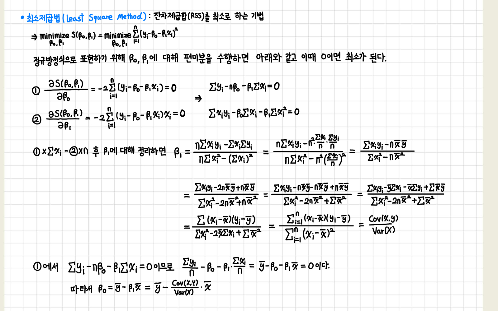 - 파라미터 계수 추정 : 최소제곱법(Least Square Method) or 최대우도법(MLE)