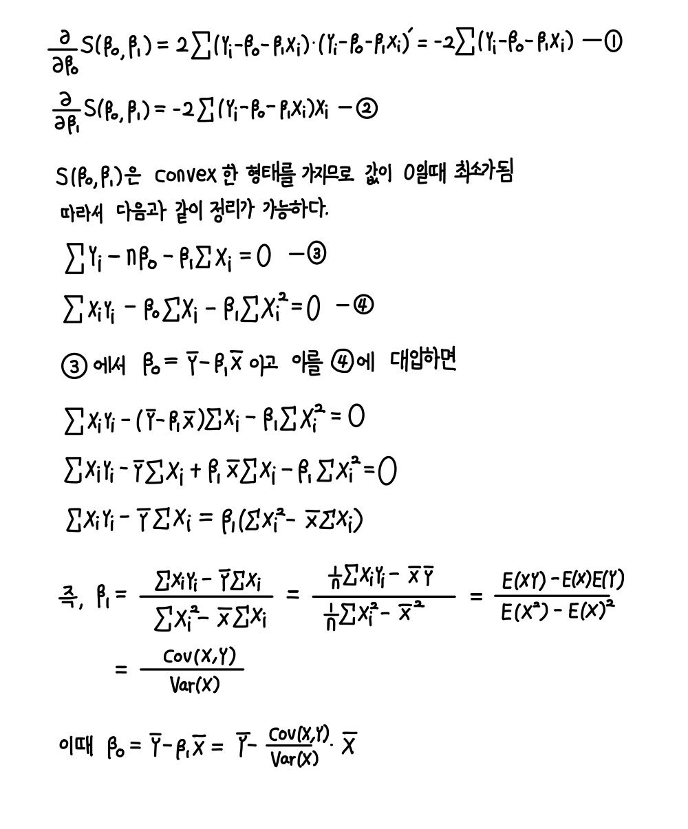 수식으로 표현하면 $S(\beta_0, \beta_1) = \sum_{i=1}^{n} \varepsilon_i^2 = \sum_{i=1}^{n}(Y_i-\beta_0-\beta_1X_i)^2$의 크기를 가장 작게해야 합니다. 따라서 각 회귀계수에 대해 편미분을 하여 가장 작아지게 하는 지점을 선택해야하며 과정은 다음과 같습니다.