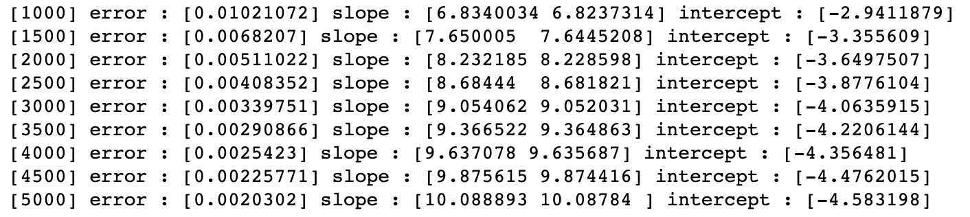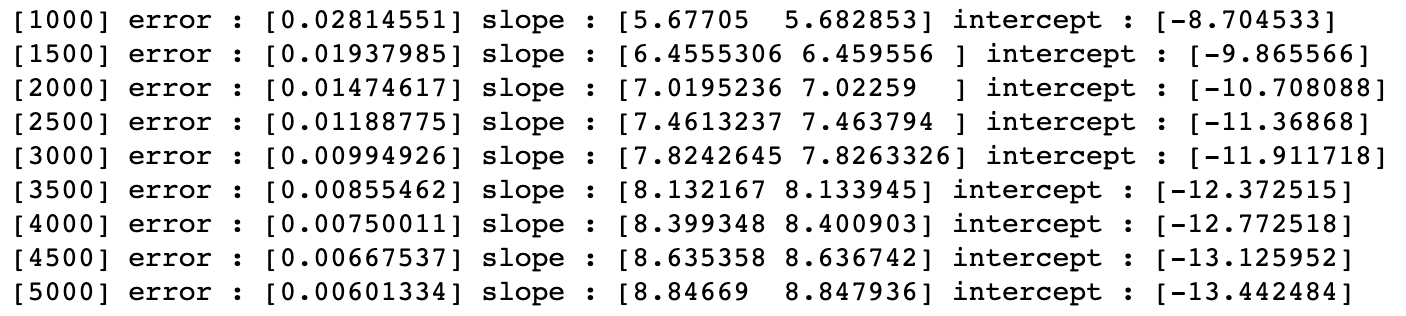 print("[",i+1,"] error : ", total_error.numpy(), " slope : ", w.numpy()," intercept : ", b.numpy(), sep="")