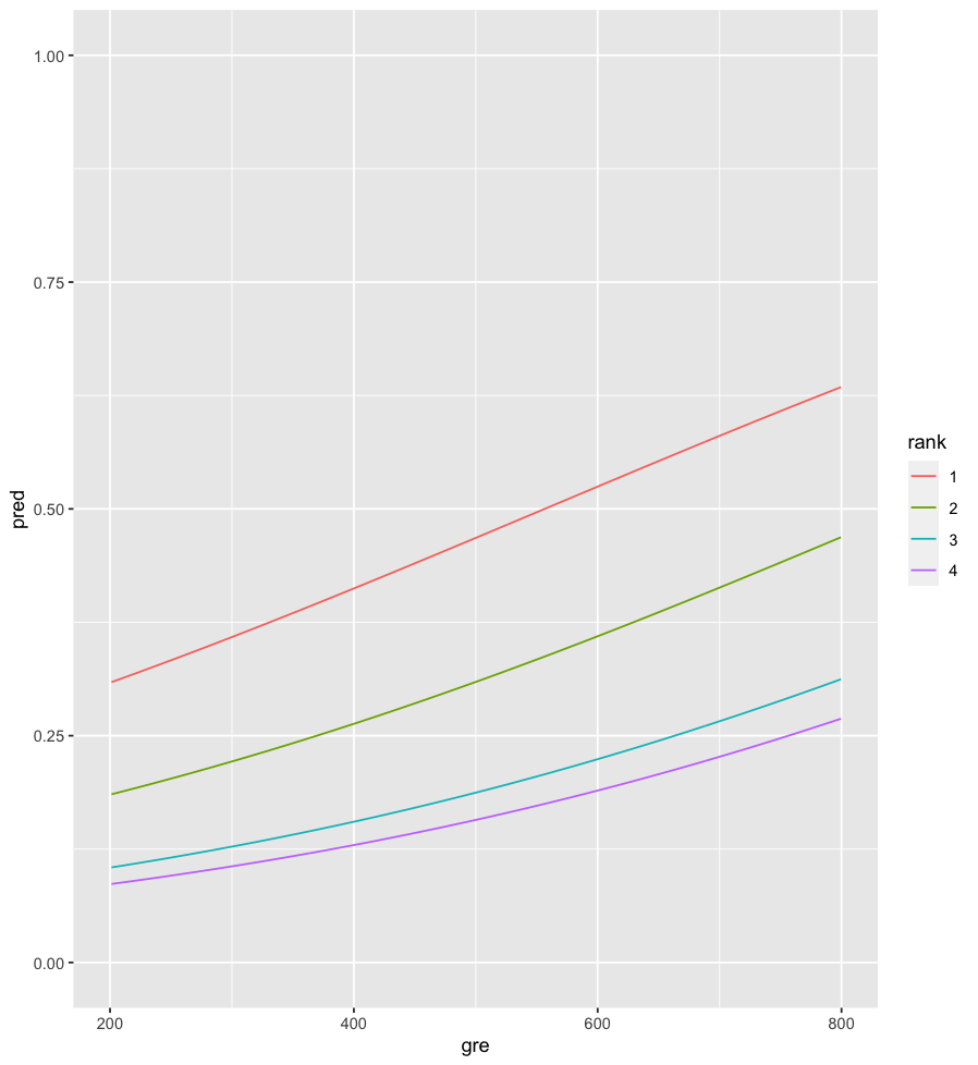 ggplot(mapping=aes(x=gre, y=pred, color = rank)) + geom_line() +