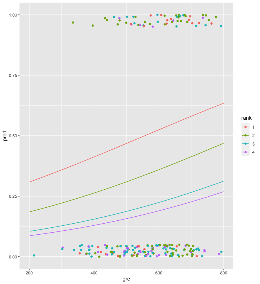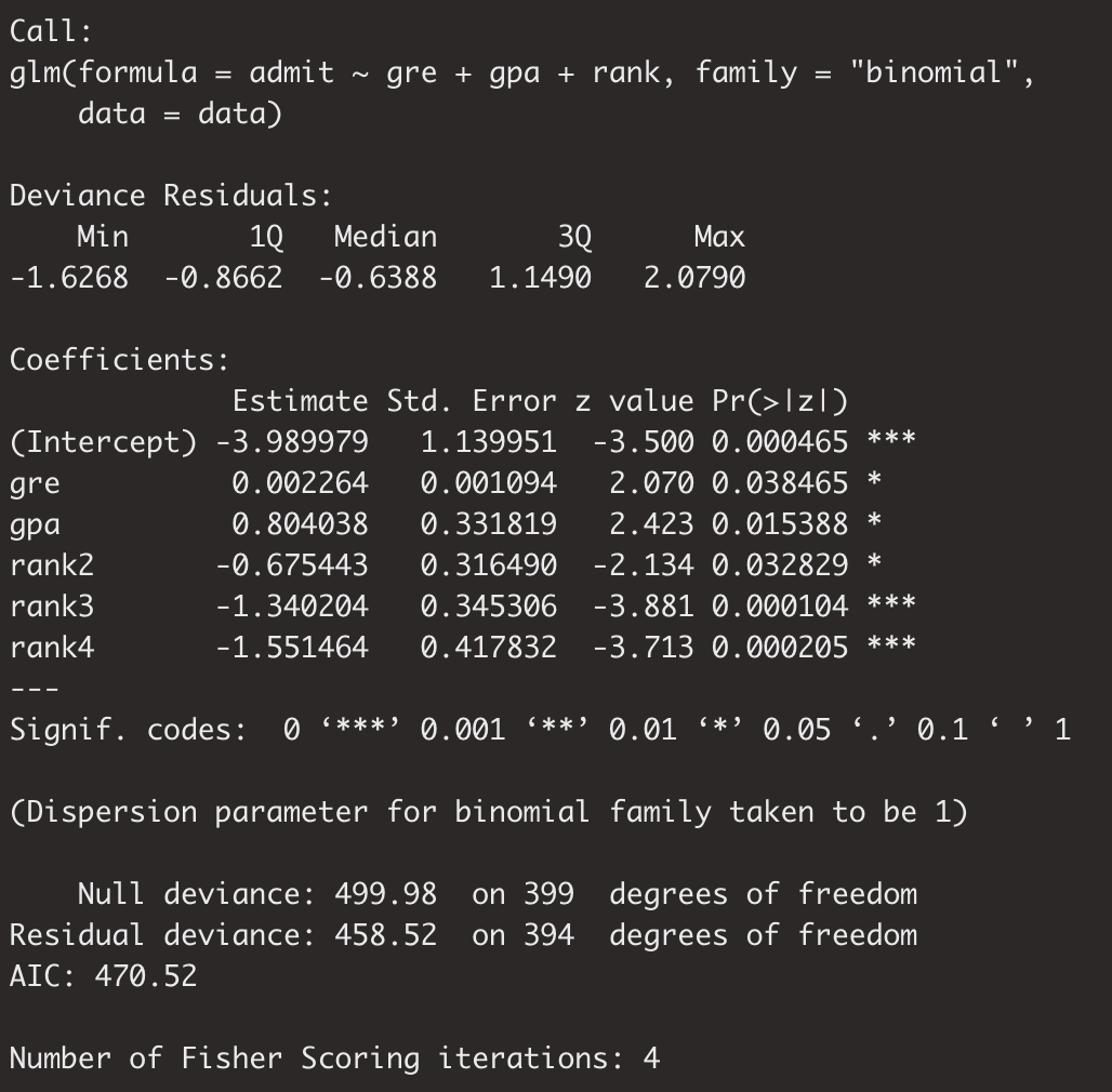 - 적합된 모델 : $P(Y=1|X) = \frac{1}{1+e^{-(-3.99+0.002gre+0.8gpa-0.675I(rank=2)-1.3I(rank=3)-1.5I(rank=4))}}$