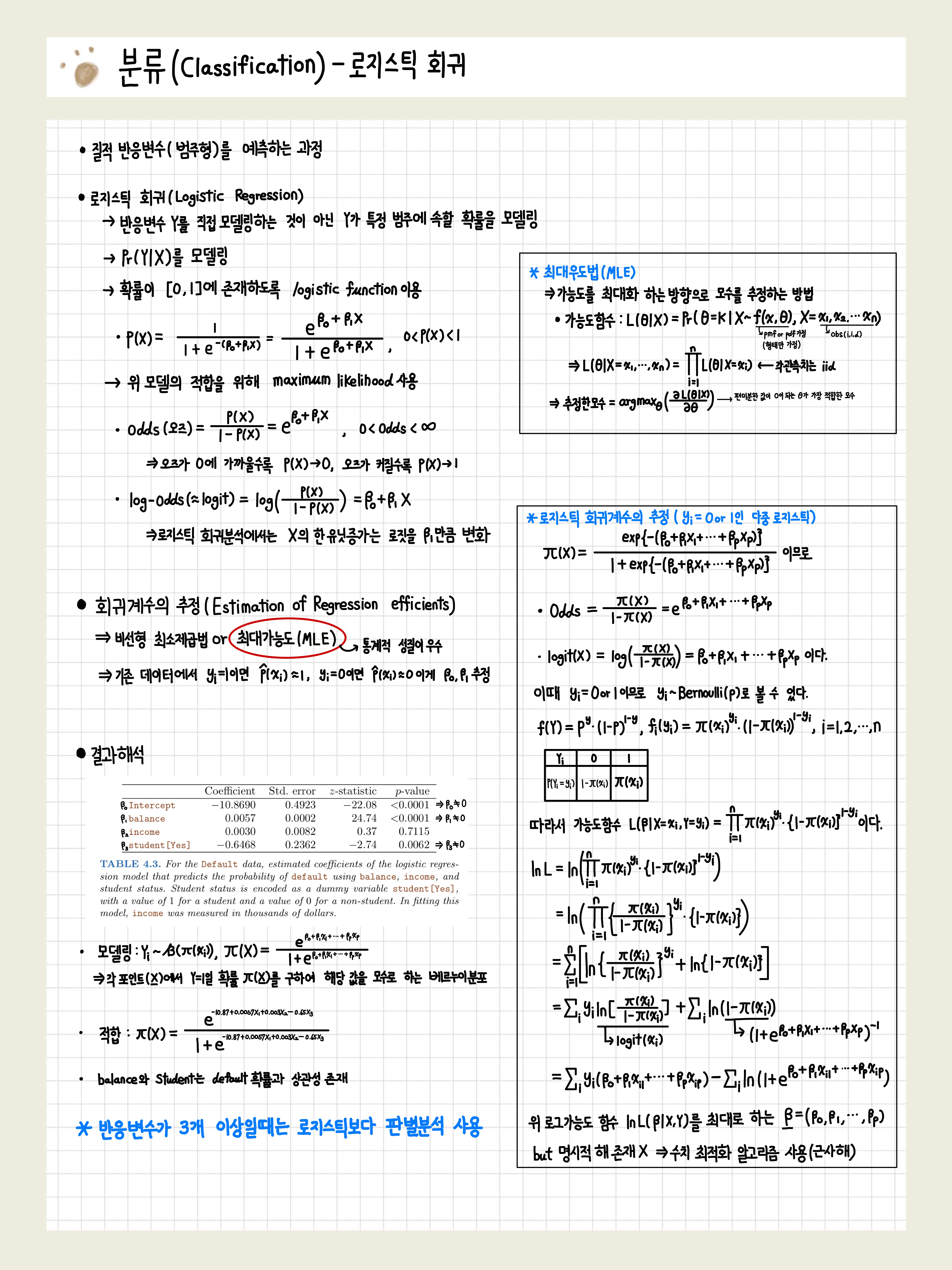 참고로 클래스(범주)의 수가 3개 이상인 경우에는 다중클래스 로지스틱회귀를 적용할 수 있으나 일반적으로 판별분석과 같은 다른 기법을 적용하는 것을 권장합니다.