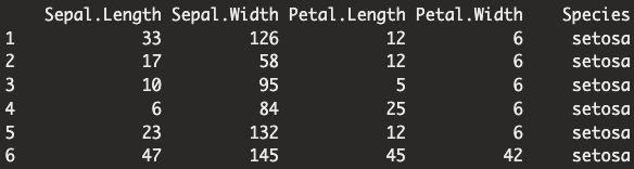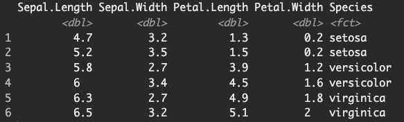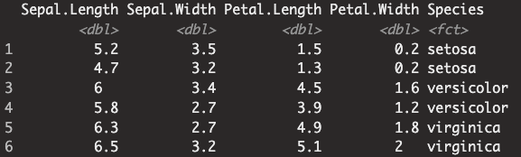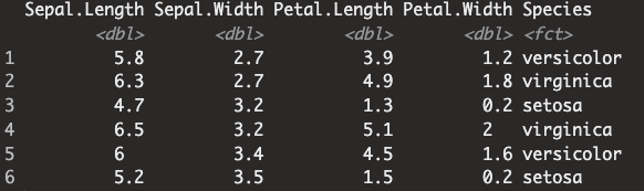 iris_test <- iris |> group_by(Species) |> slice_sample(n=2)