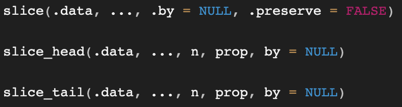 - slice_head와 slice_tail은 각각 첫번째, 마지막부터 n개의 행을 선택 (prop 인자 제공시 nrow(data)*prop의 수만큼)
