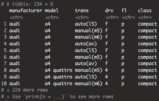 예시) mpg에서 문자형 열만 출력하기 위해 select / keep / discard 함수를 활용한 코드