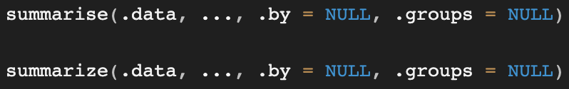 - [파라미터 설명] 그룹화 된 데이터 프레임에 summarise를 적용하는 경우 기본적으로 마지막 그룹화 변수를 벗겨내지만(peel off) .groups 옵션을 통해서 제어할 수 있다. (default = "drop_last", "drop"(그룹화 해제), "keep"(그룹화 유지))
