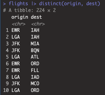 - unique.data.frame 함수와 동작 방식이 유사하며 distinct(df, col1, col2)는 unqiue(select(df, col1, col2))와 같다.