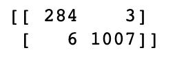 - 정확도(Accuracy) : (284+1007) / (284+3+6+1007) = 0.9931