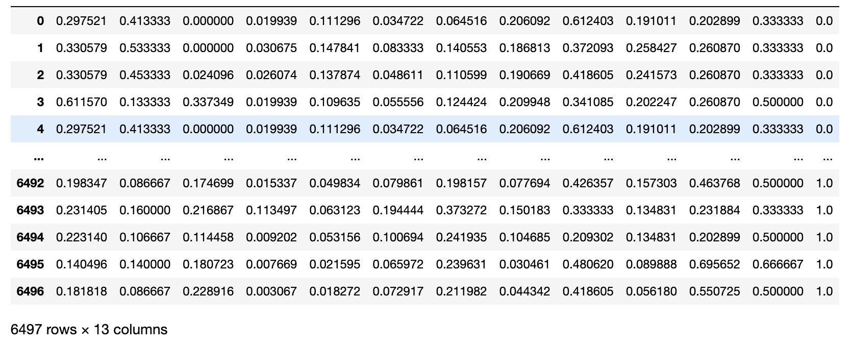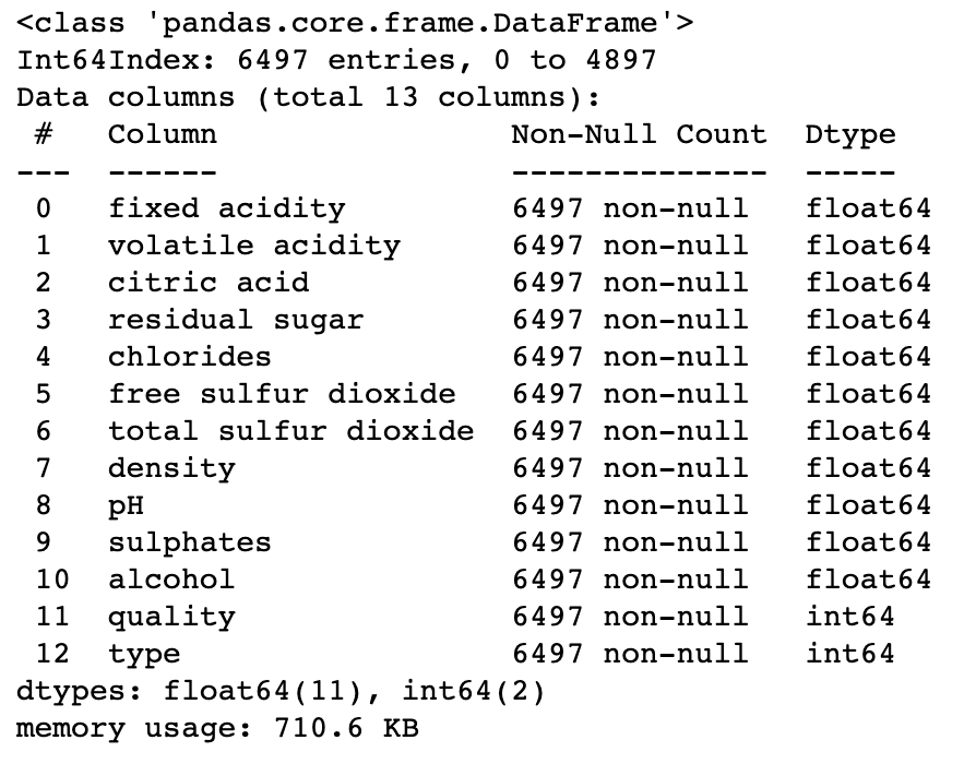 - 전체데이터는 6497개이며 변수는 13개가 있는 것을 확인할 수 있습니다