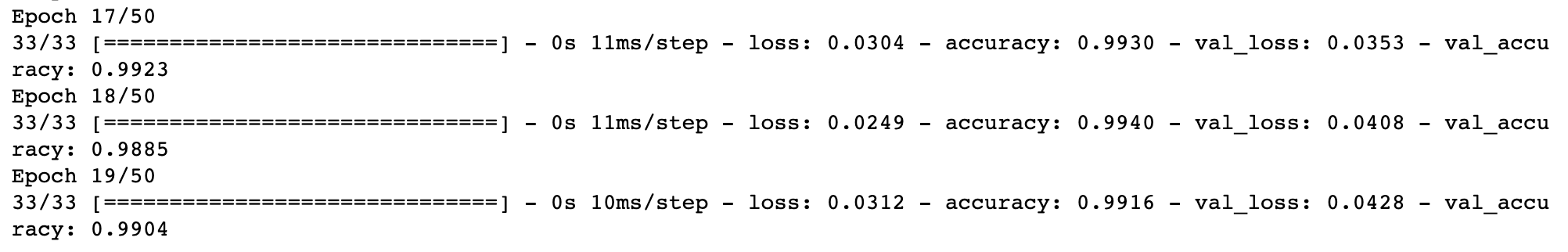- 반복수는 50번이나 19번에 학습이 끝났는데 이는 과적합을 방지하는 EarlyStopping을 사용하였기 때문입니다.