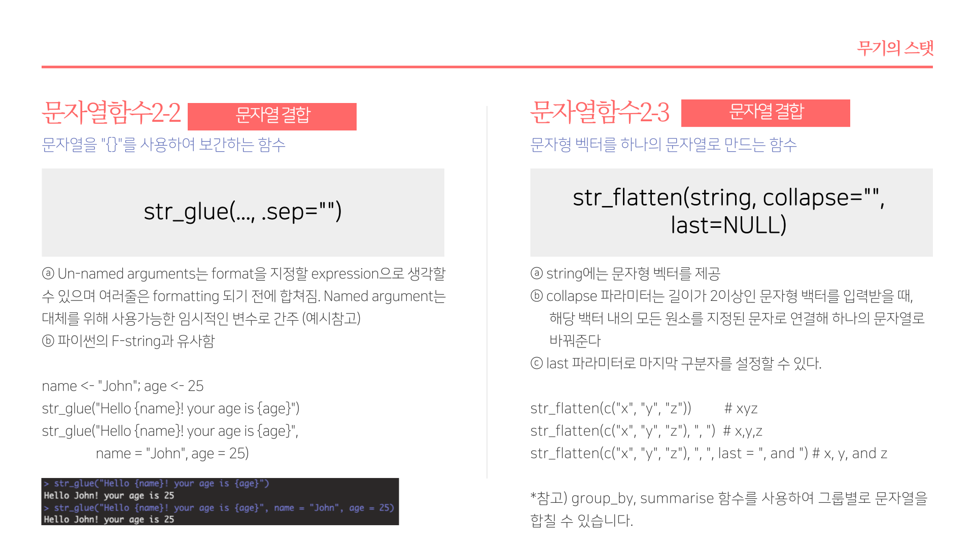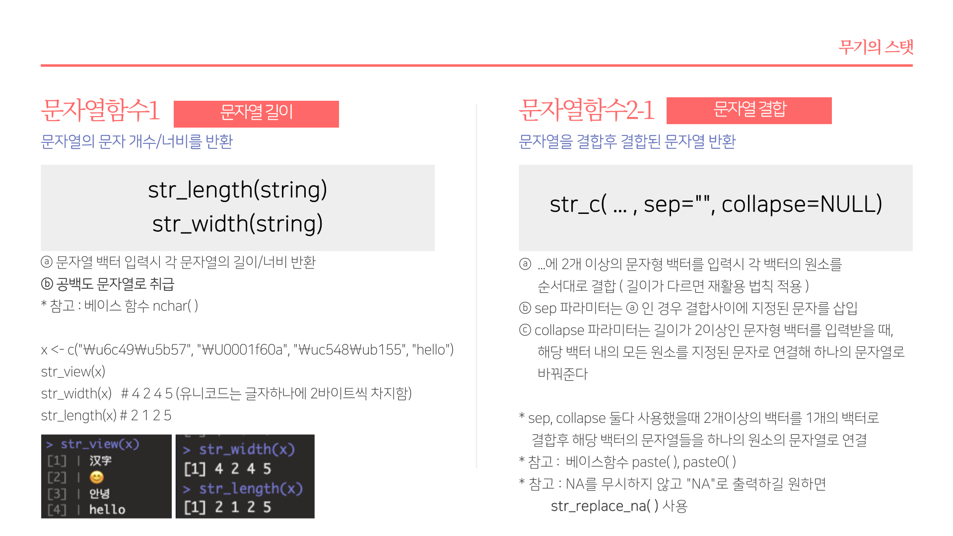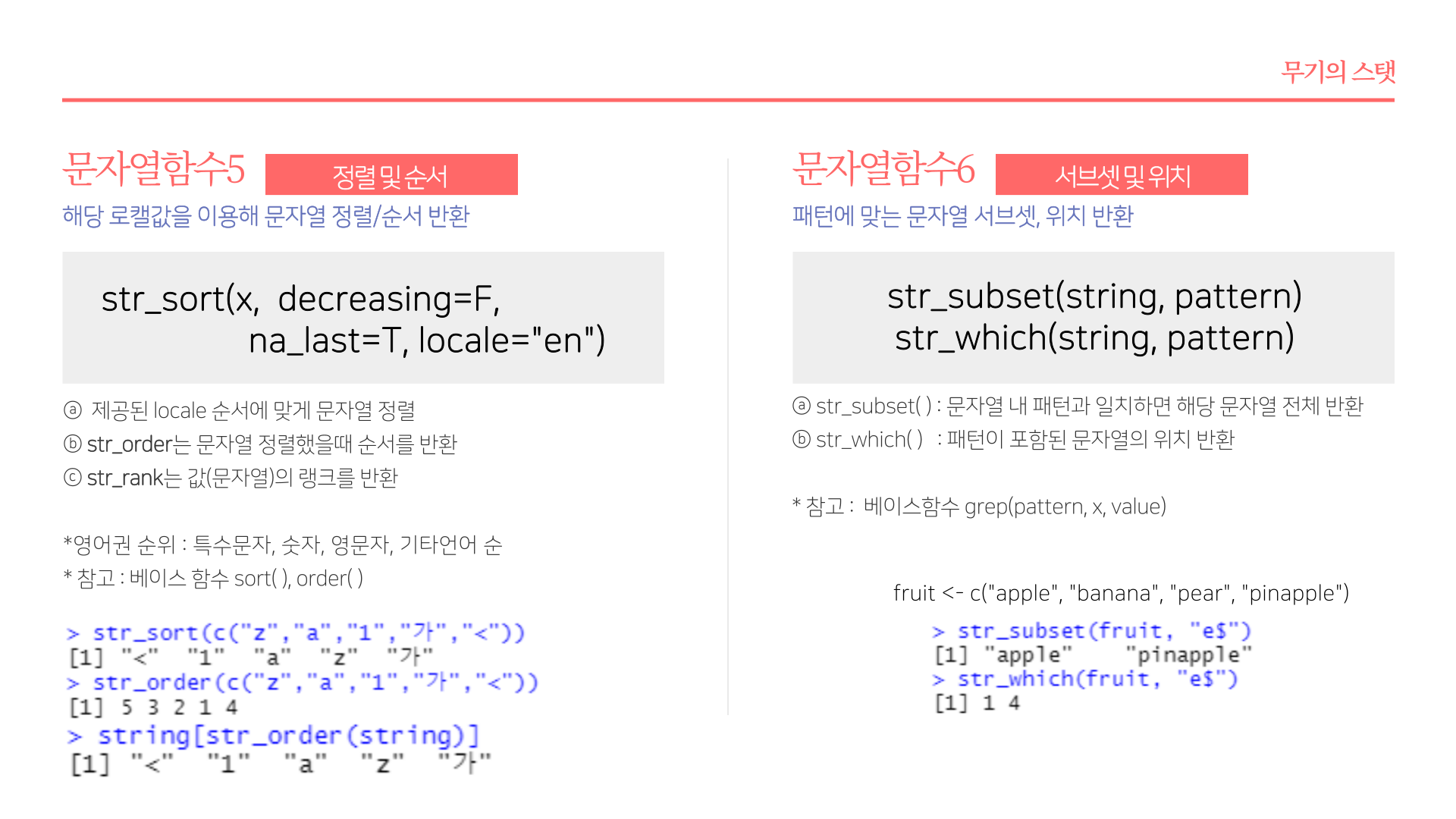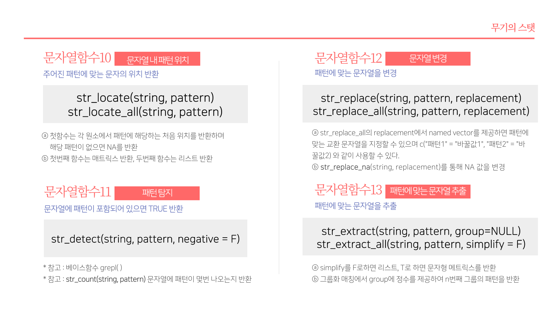 * 요약 : str_length(문자열길이), str_c(문자열결합), str_glue(파이썬 F-string 유사 함수), str_sub(각 문자열 서브셋팅), str_sort(order, rank, 문자열 정렬 및 순서), str_subset(서브셋), str_which(패턴에 맞는 문자열 위치), str_split(문자열 분리), str_replace_na(NA를 "NA"로 변환), str_locate(문자열 패턴 위치), str_detect(패턴감지), str_replace(문자열 변경), str_extract(문자열 추출)