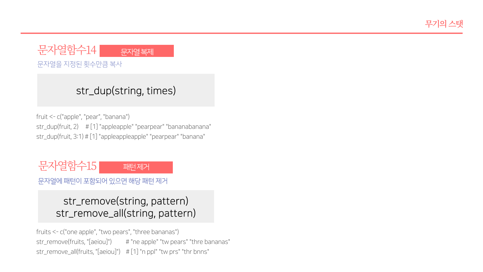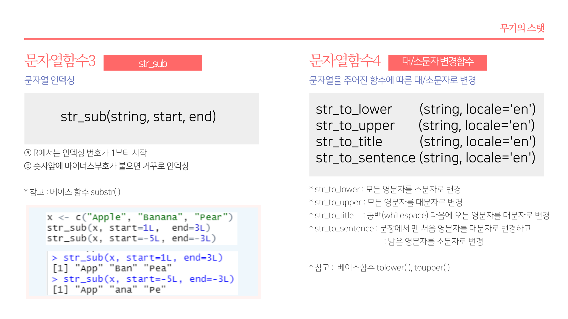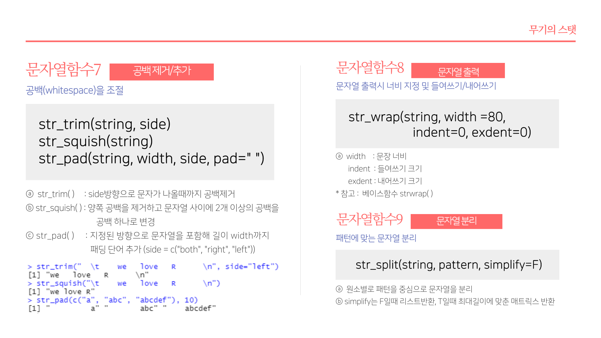 * 요약 : str_length(문자열길이), str_c(문자열결합), str_glue(파이썬 F-string 유사 함수), str_sub(각 문자열 서브셋팅), str_sort(order, rank, 문자열 정렬 및 순서), str_subset(서브셋), str_which(패턴에 맞는 문자열 위치), str_split(문자열 분리), str_replace_na(NA를 "NA"로 변환), str_locate(문자열 패턴 위치), str_detect(패턴감지), str_replace(문자열 변경), str_extract(문자열 추출)
