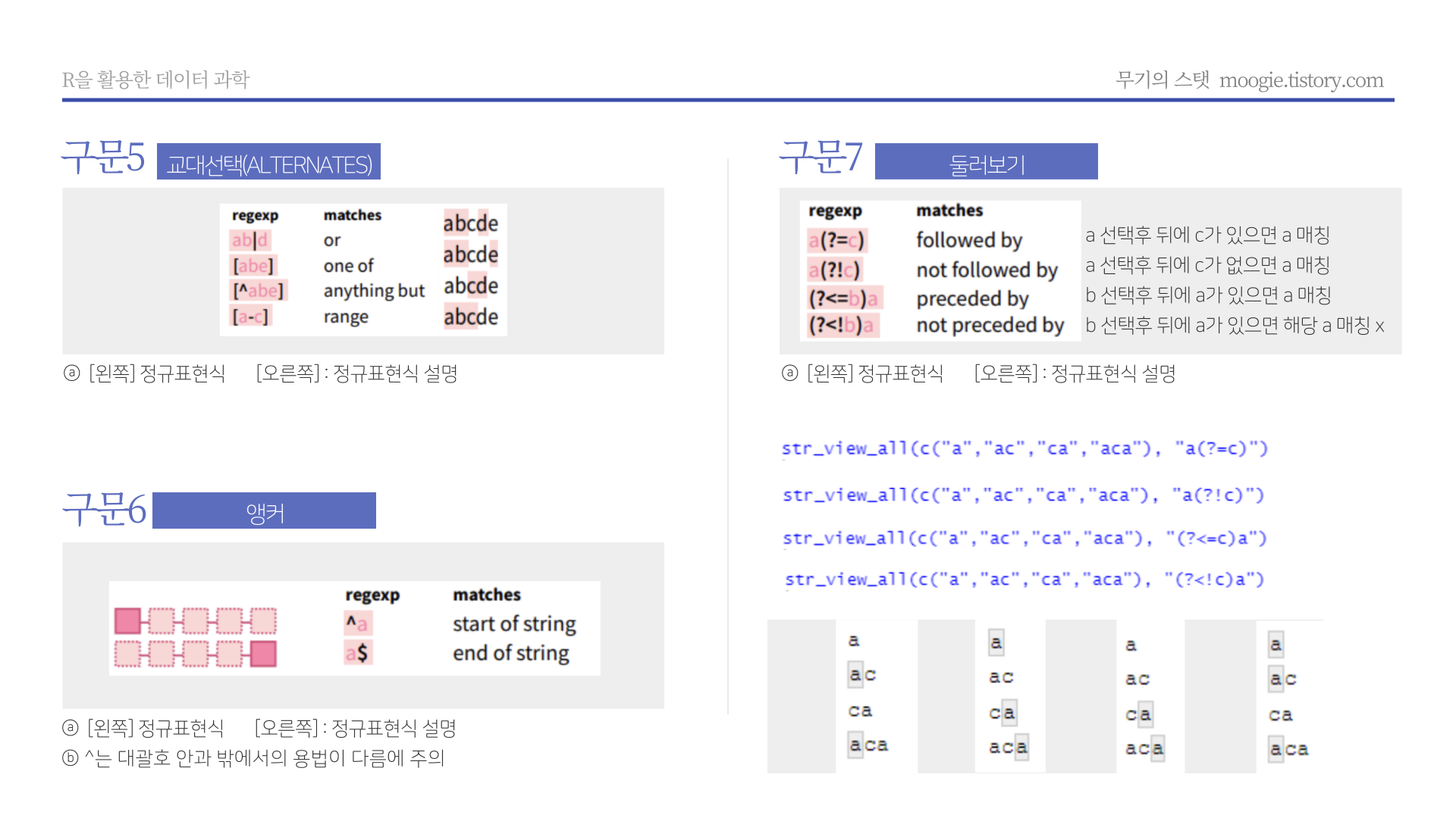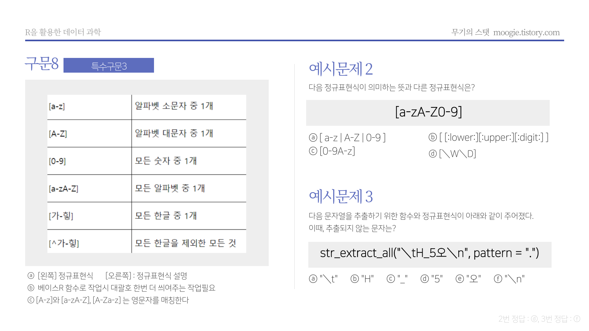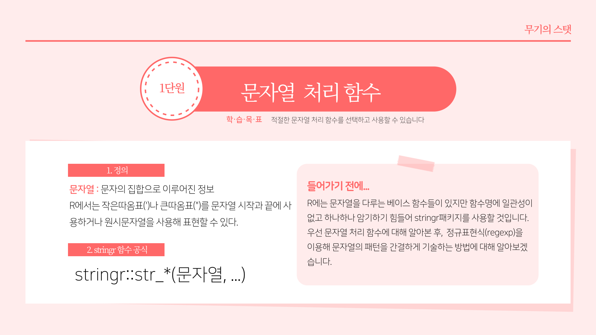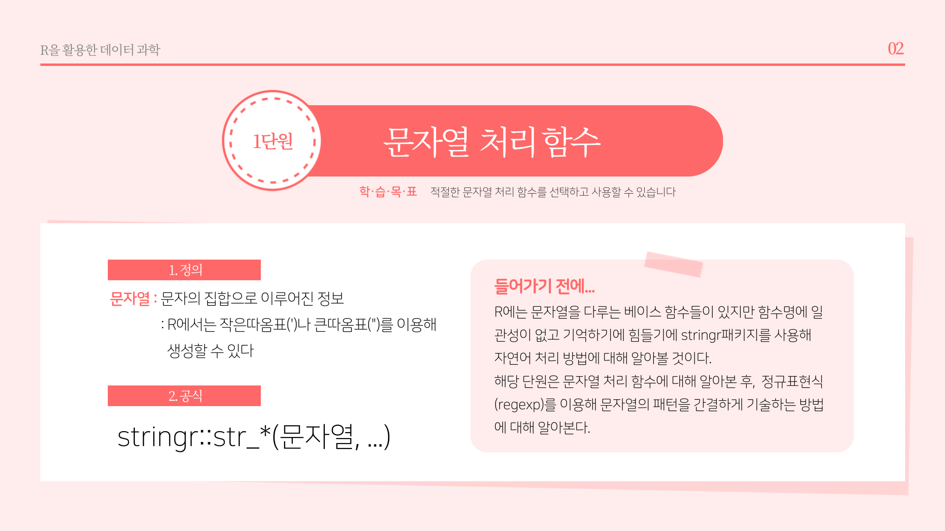 * 요약 : str_length(문자열길이), str_c(문자열결합), str_glue(파이썬 F-string 유사 함수), str_sub(각 문자열 서브셋팅), str_sort(order, rank, 문자열 정렬 및 순서), str_subset(서브셋), str_which(패턴에 맞는 문자열 위치), str_split(문자열 분리), str_replace_na(NA를 "NA"로 변환), str_locate(문자열 패턴 위치), str_detect(패턴감지), str_replace(문자열 변경), str_extract(문자열 추출)