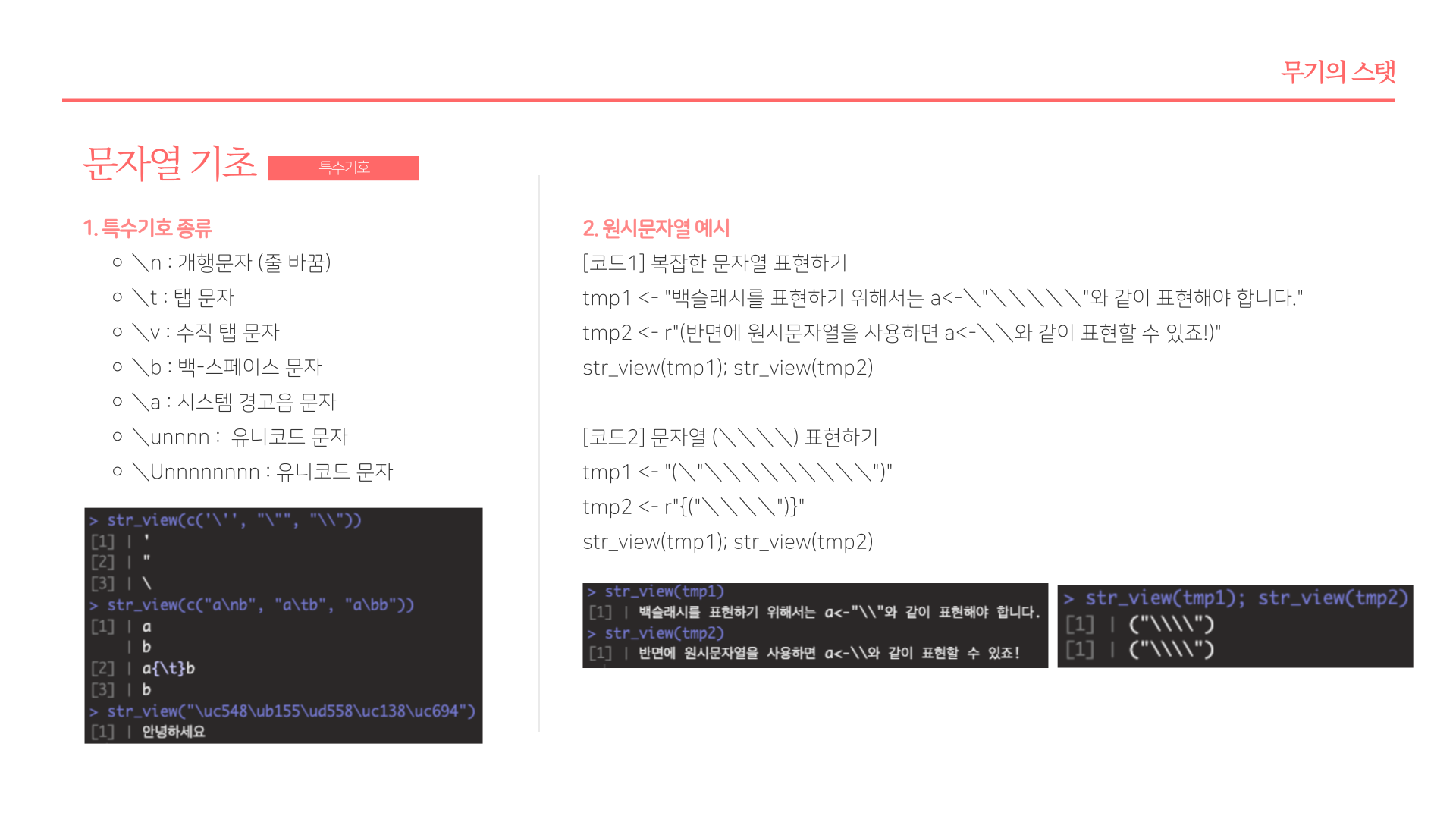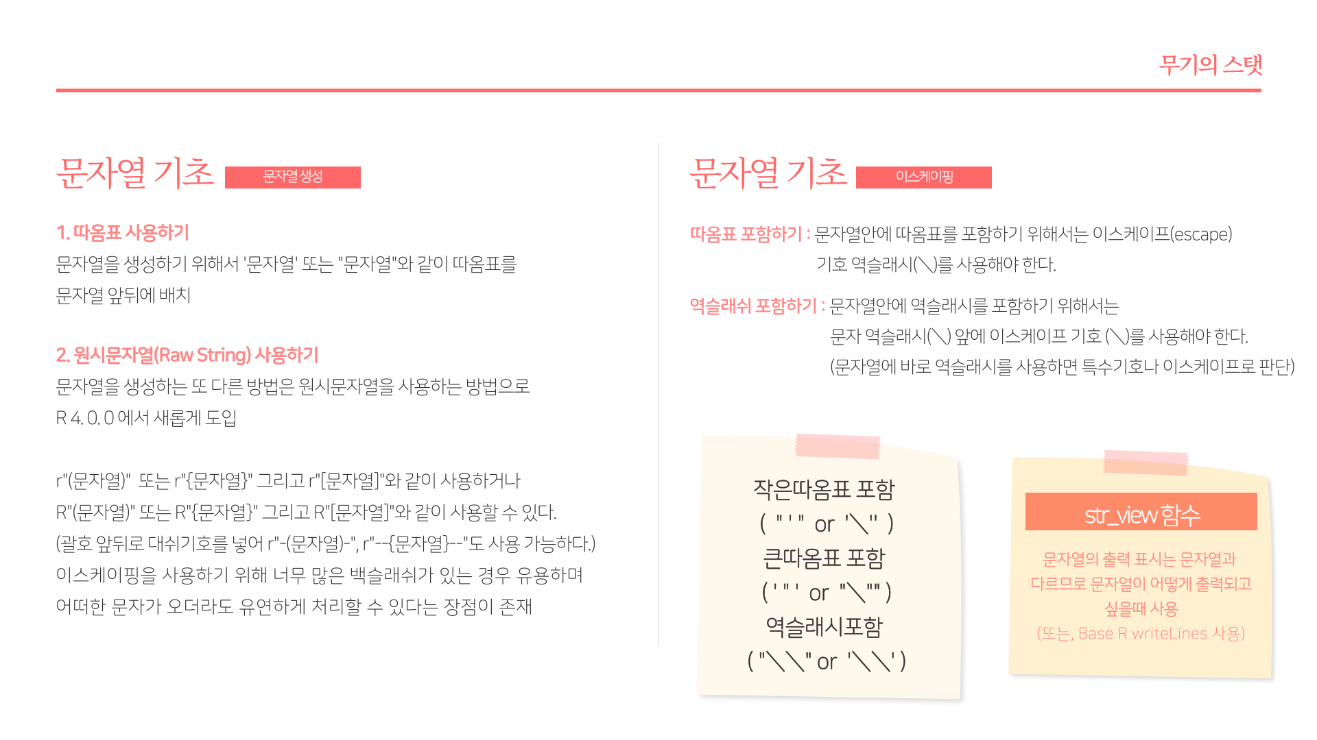 - 문자열의 원시(출력) 형태 확인 : writeLines, stringr::str_view
