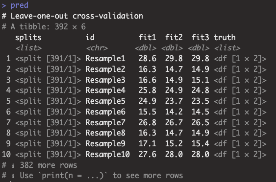 mutate(truth = map(.x=splits, .f=function(df) df %>% assessment() %>% select(mpg, horsepower)))