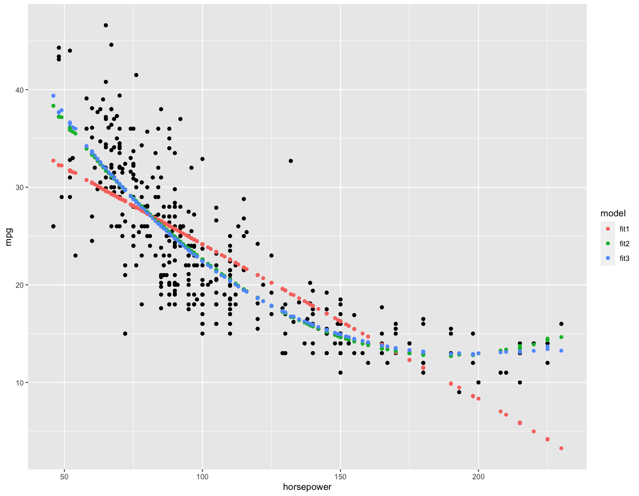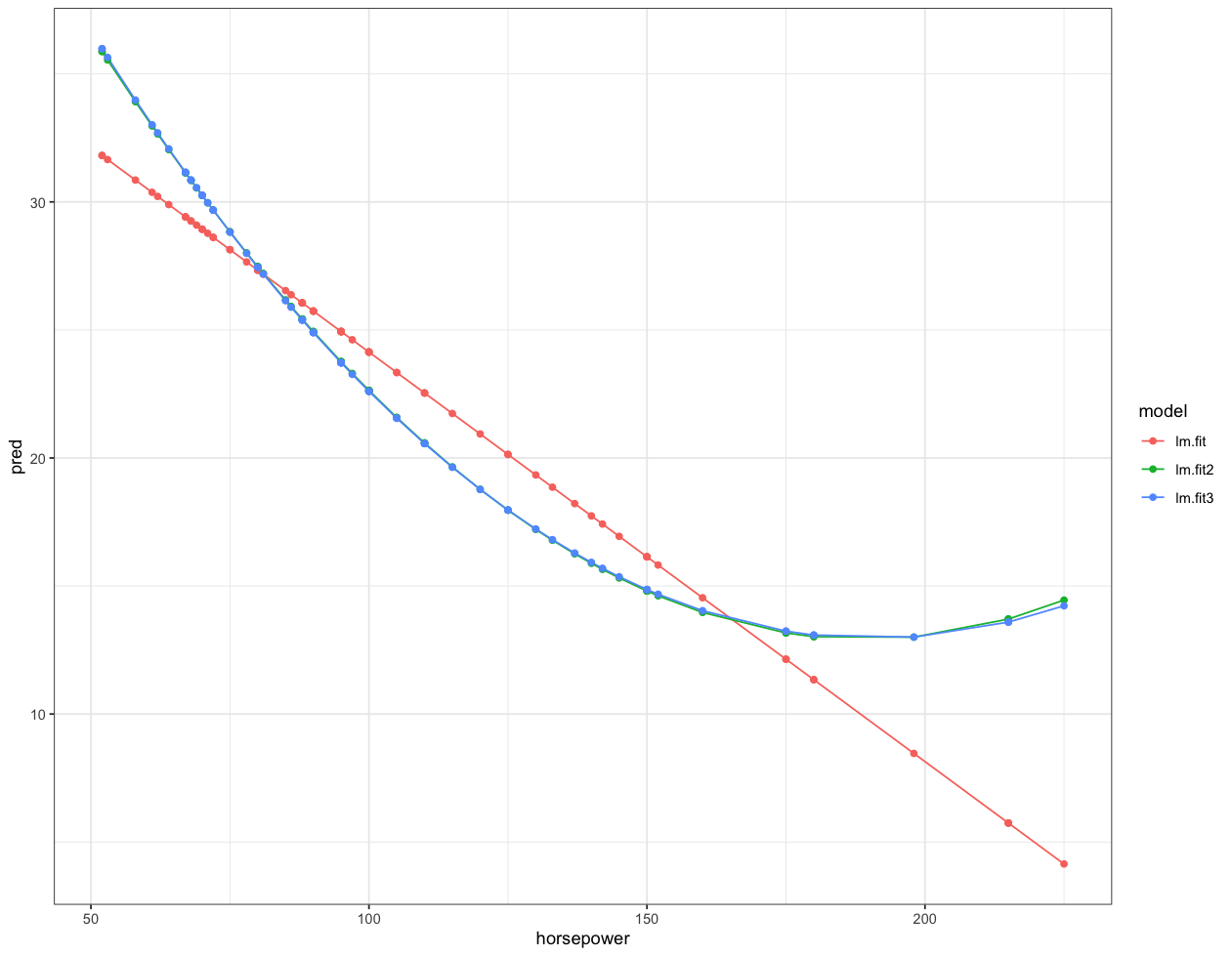 test %>% select(mpg, horsepower) %>% modelr::gather_predictions(lm.fit, lm.fit2, lm.fit3) %>%