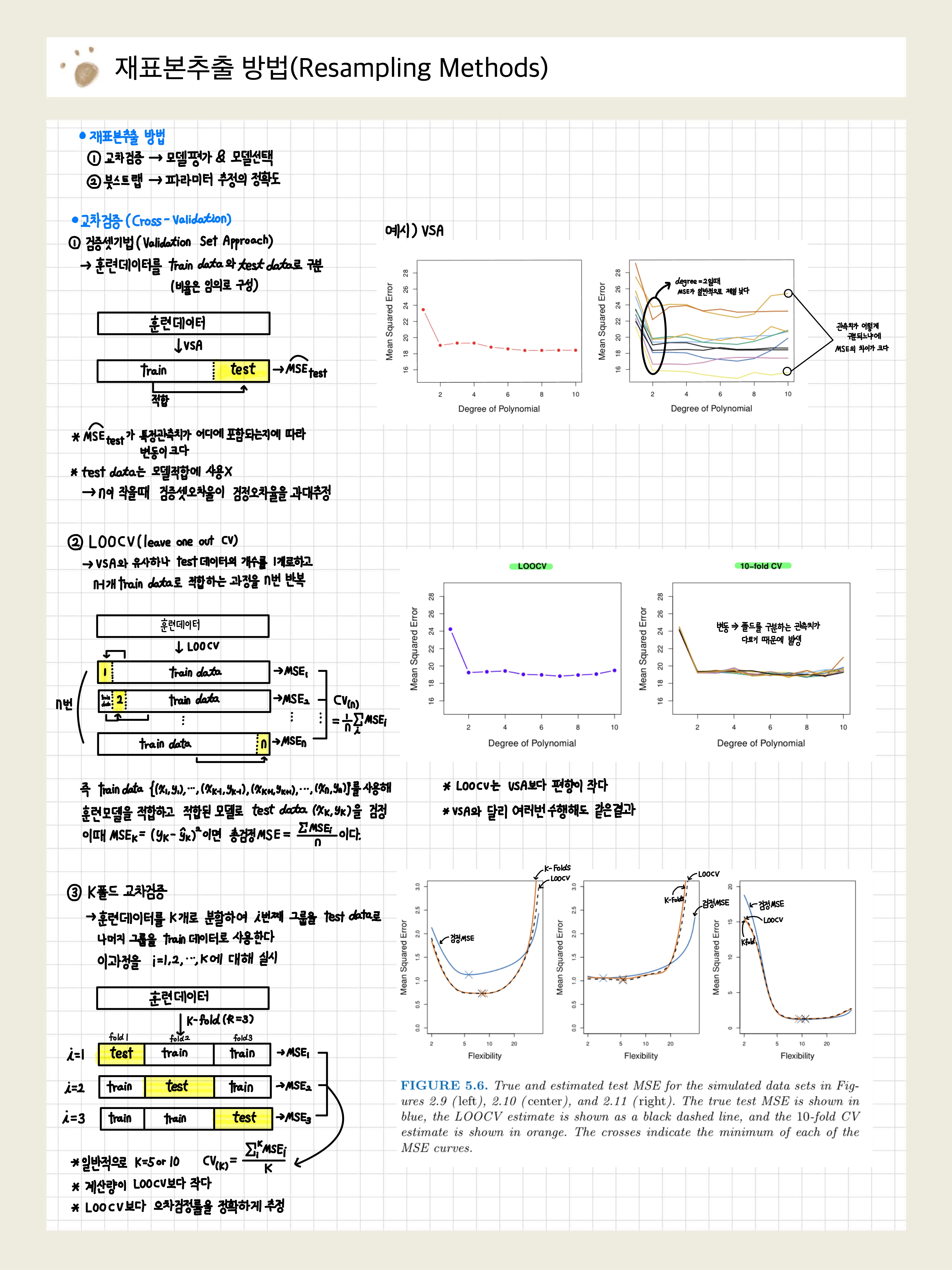 - LOOCV보다 계산량이 적으며 검정오차율을 더 정확하게 추정한다는(=분산이 낮음) 장점이 있음