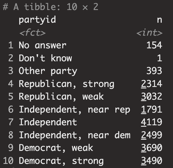 x |> fct_lump_prop(0.10) |> table() # 관측치수가 862 * 0.1 보다 작은 범주는 하나로 묶임
