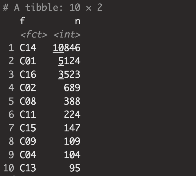 x |> fct_lump_min(100)|> table() # 100보다 적은 관측치를 가지는 범주들은 하나로 묶임
