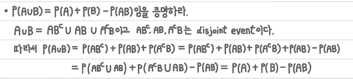 마지막 두 사건의 합집합(Union)의 확률 공식은 아래와 같이 disjoint한 사건으로 나누어 증명이 가능합니다.