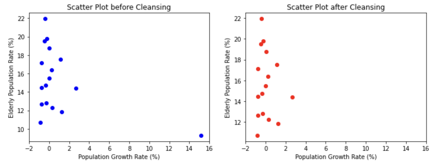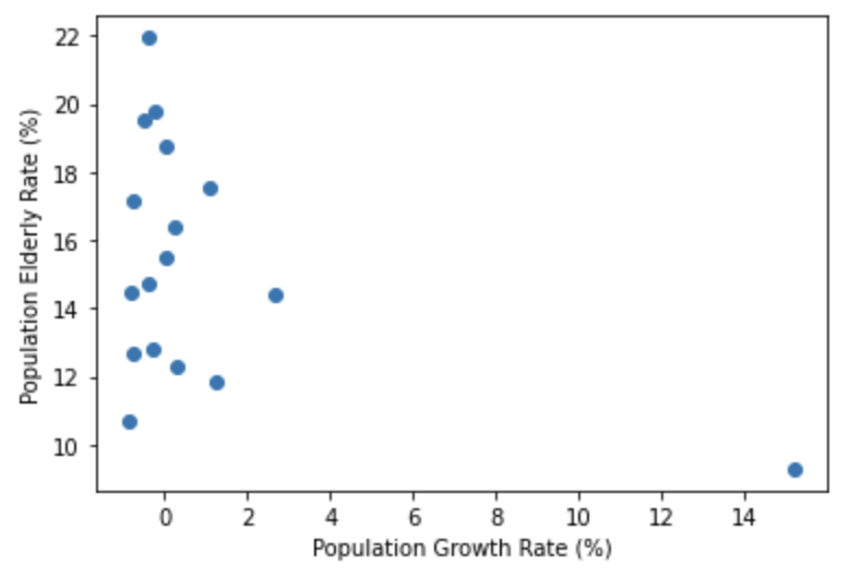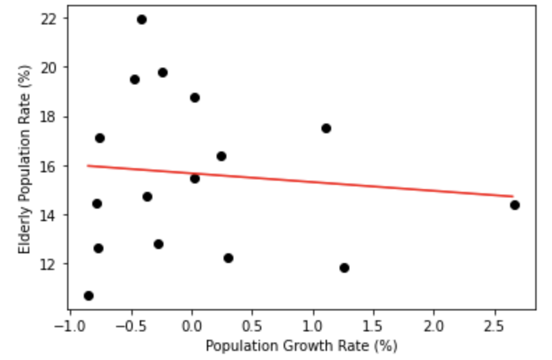 따라서 단순하게 인구증가율이 높아질수록 고령인구비율이 작아진다고 볼 수 있는데요. 이를 시각화해보도록 하겠습니다.