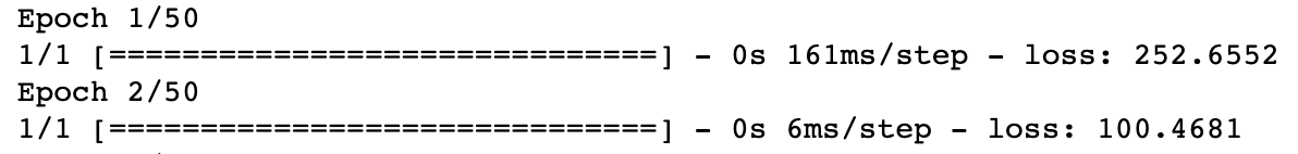 결과를 보면 초기에는 손실(loss)가 252, 100으로 높았으나 점점 모델이 데이터를 학습하면서 10 이하로 떨어진 것을 볼 수 있습니다.