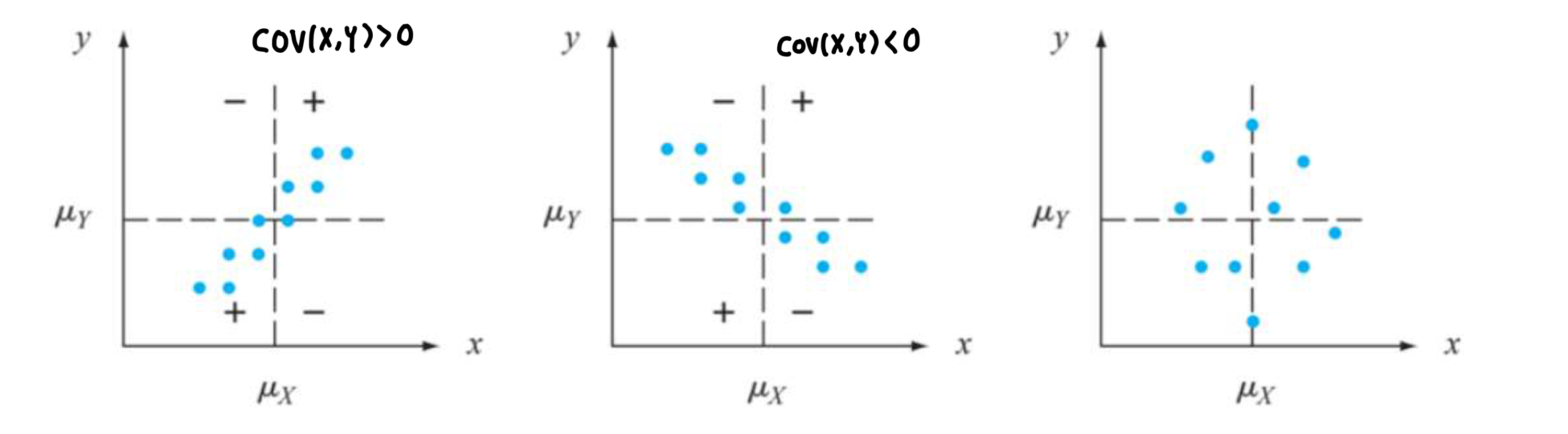 - Covariance : $Cov(X,Y) = E[(X-u_x)(Y-u_y)] = \sigma_{xy}$