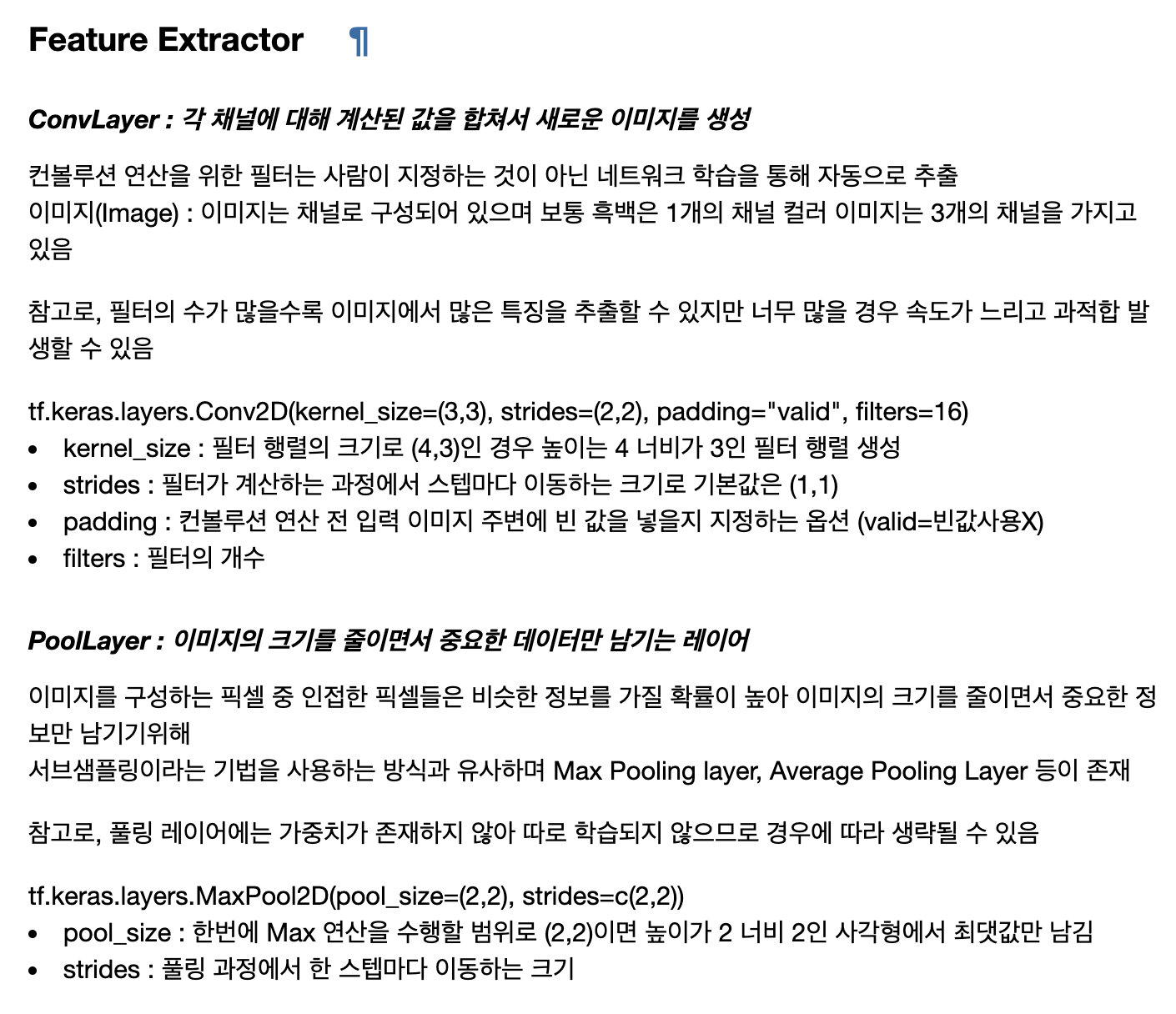 한편으로 이미지 분류를 위한 합성곱 신경망에는 크게 특징 추출기(Feature Extractor)와 분류기(Classifier)로 구분이 가능한데, 추출기에서는 이미지의 특징을 다차원으로 구분한 필터를 사용하여 새로운 이미지(feature map)를 생성합니다. 또한 추출기는 주로 합성곱 레이어와, 풀링 레이어가 혼합된 형태를 가지고 있습니다. 이때, 합성곱 레이어는 이미지 일부에 해당되는 픽셀에 해당되는 값과 주변 픽셀의 값을 사용하는데 이는 이미지 데이터에서 서로 가까이 이는 픽셀은 공간적으로 관련이 있다고 가정하기 때문입니다. 하여튼 이런 부분 이미지 값에 필터에 적용하여 이미지 특징을 추출하며 풀링 레이어에서는 이미지의 크기를 줄이면서 중요한 데이터만 남기는 서브샘플링 역할을 하고 있습니다. 각 레이어의 사용법과 파라미터는 아래 이미지에서 확인해주세요.