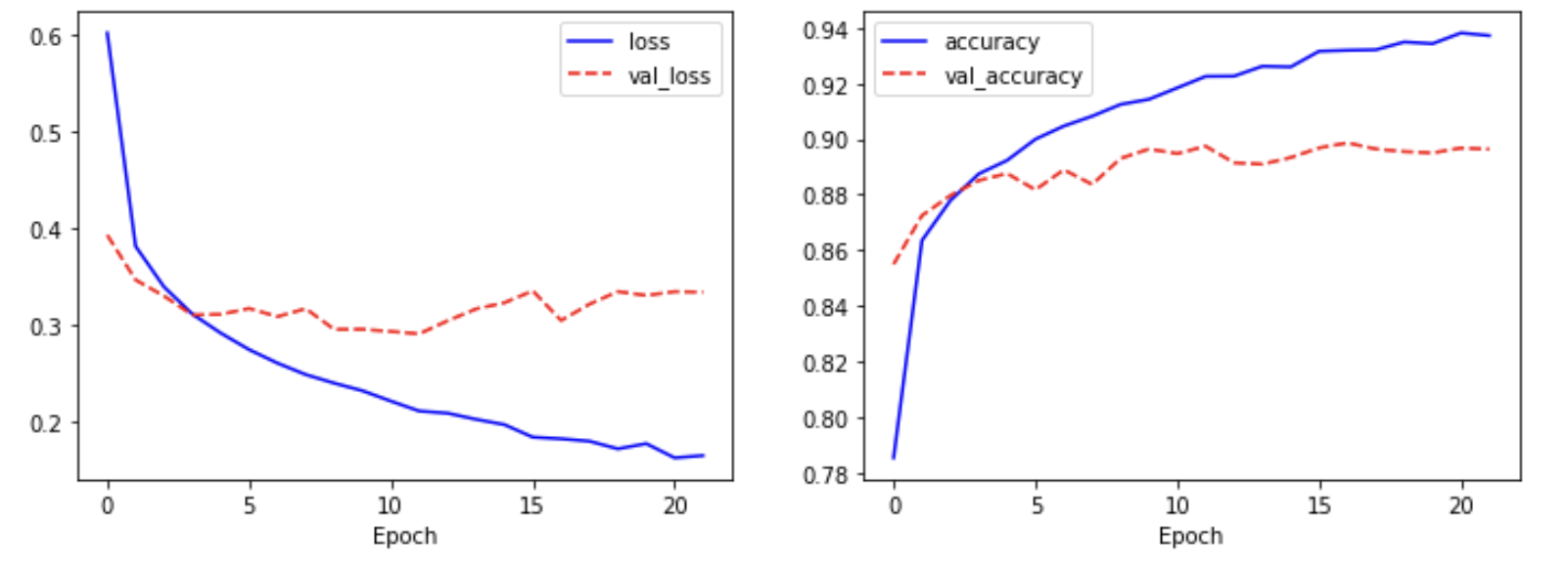 - [0.3534, 0.8898]로 모델의 손실값은 0.3534, 정확도는 88.98%로 상당히 잘 분류하는 것을 확인할 수 있습니다.